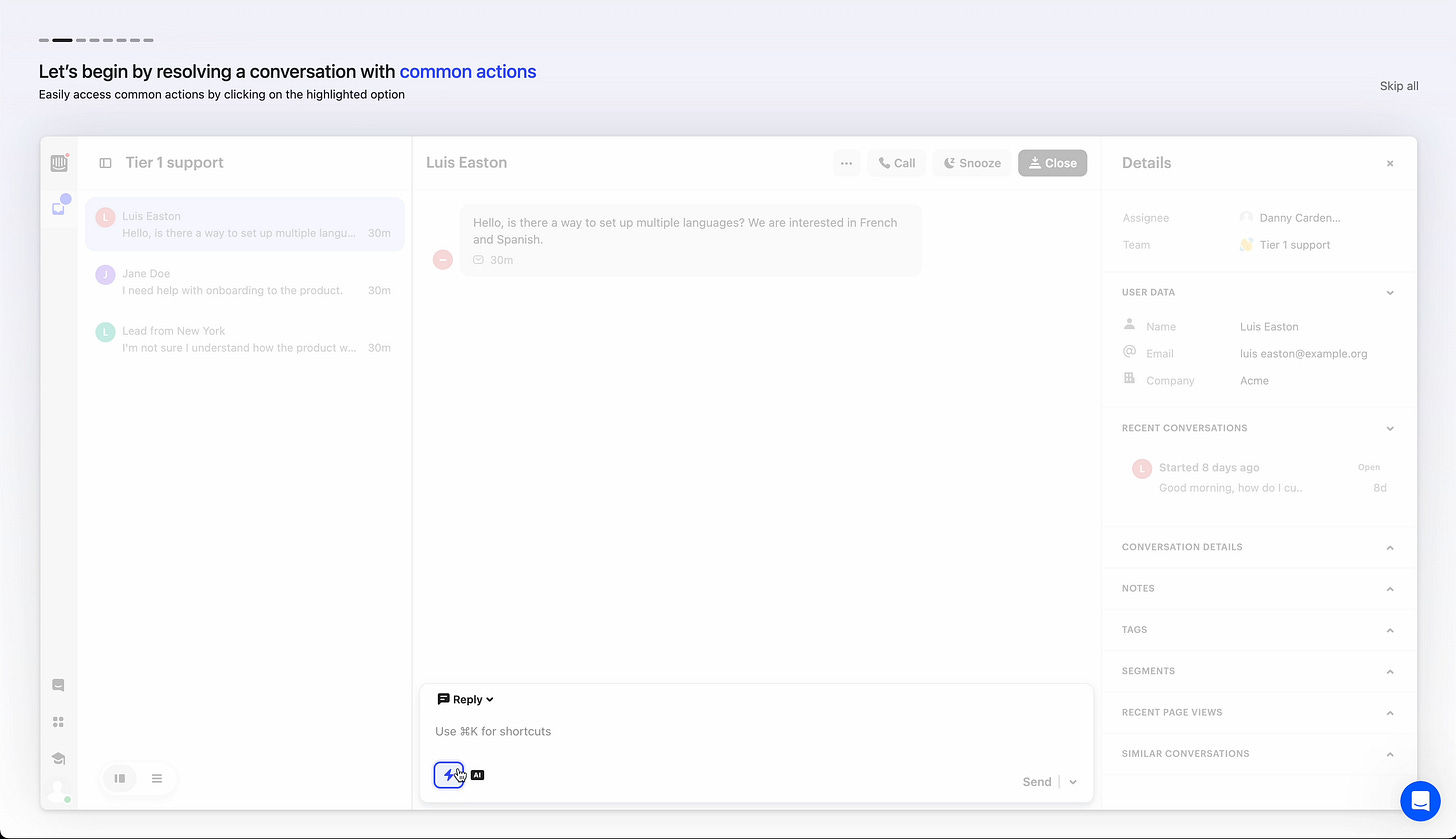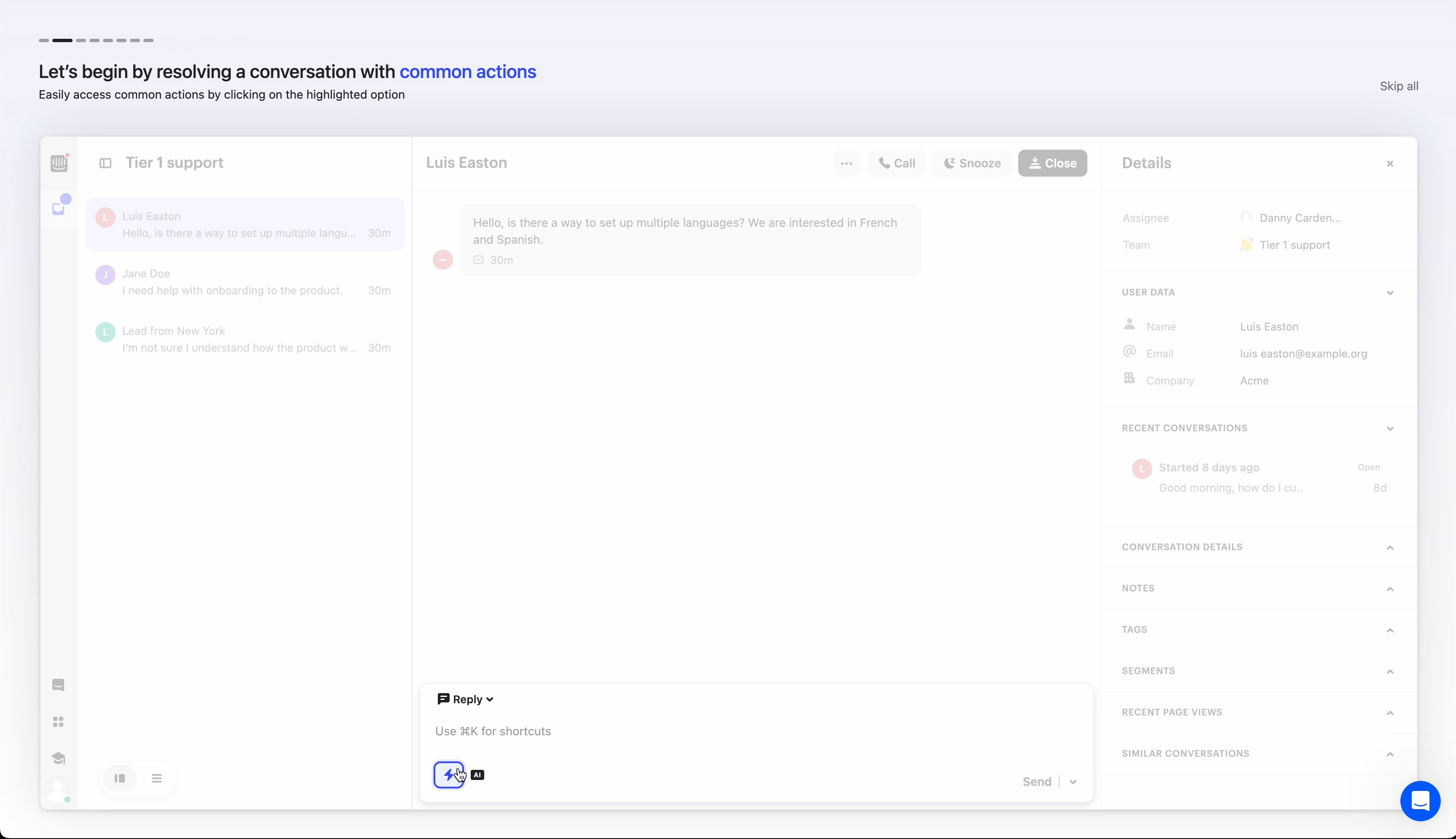 Great move to make the primary button a use case action, "Resolve a conversation," vs. a generic "Next." It helps paint a better picture of what you are about to do.