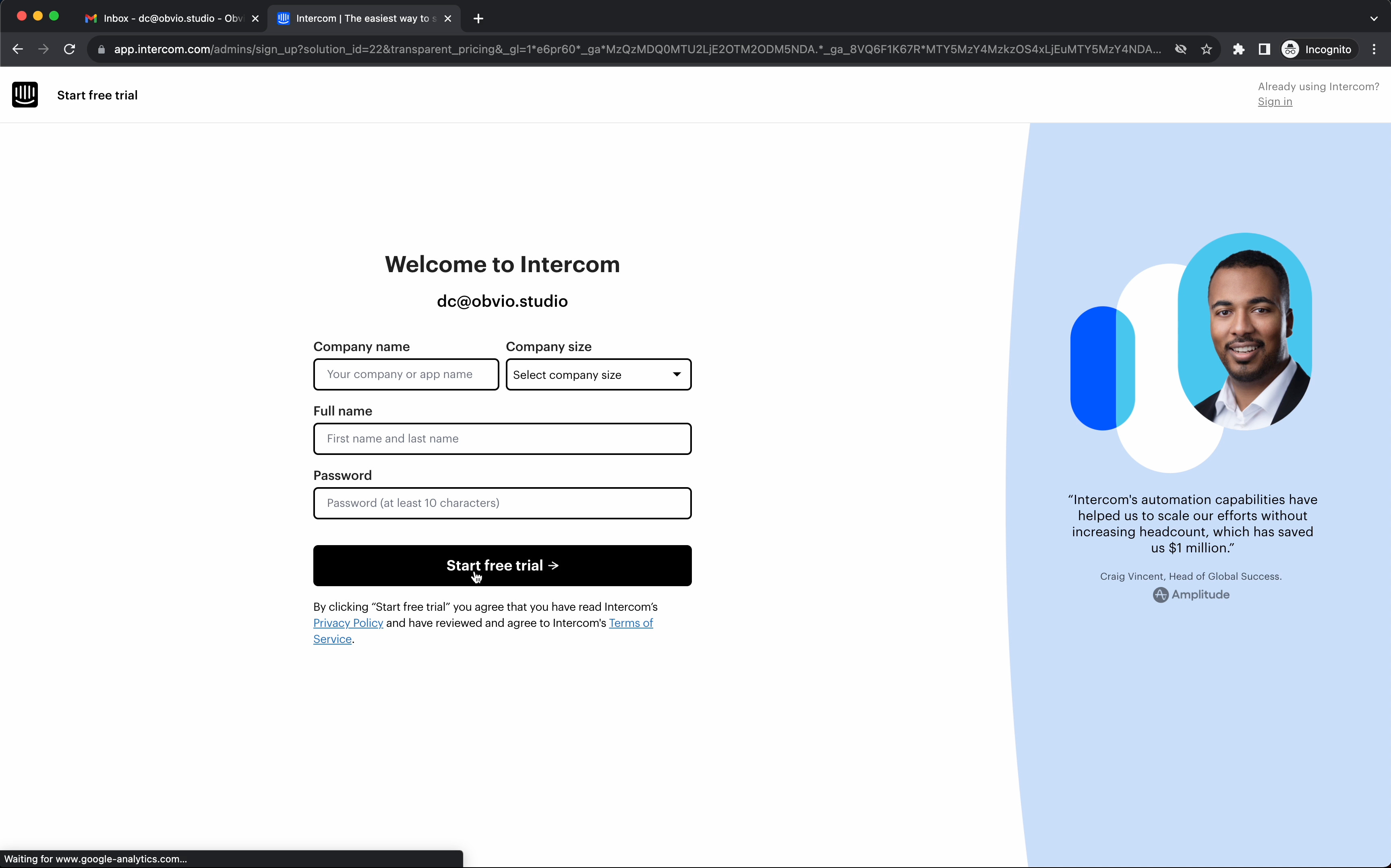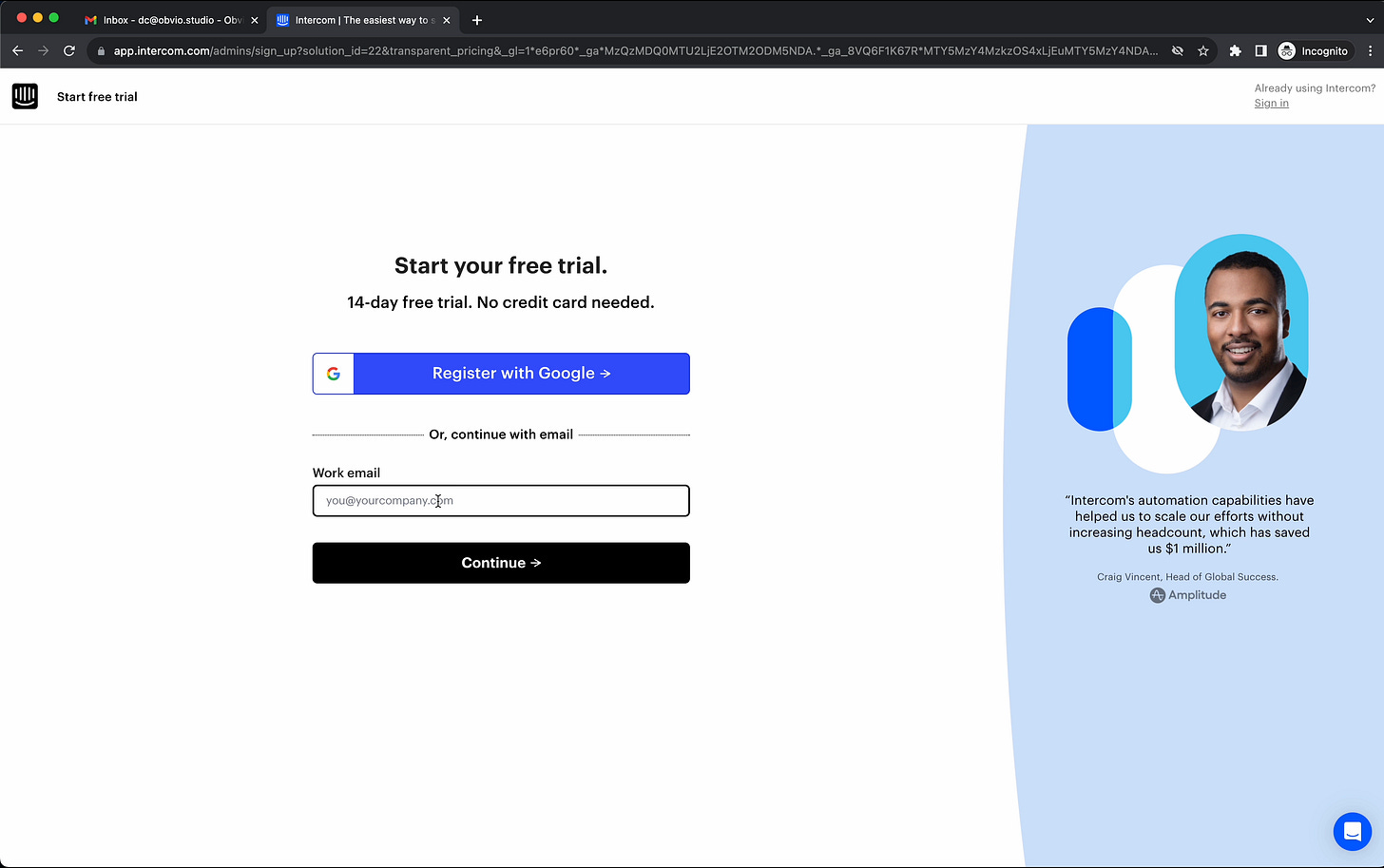 2/ A simple and straight forward sign-up page. Sign in with gmail or continue with a work email.